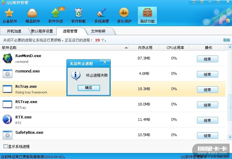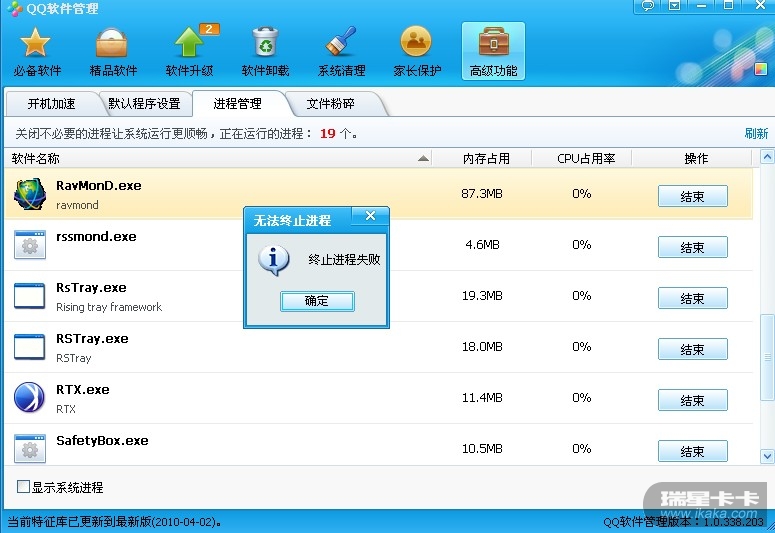 QQ软件管理这么厉害?和冰刃一样厉害?我用360安全卫士都结束不了瑞星,用QQ软件管理给瑞星KO了,虽然瑞星监控又启动了??