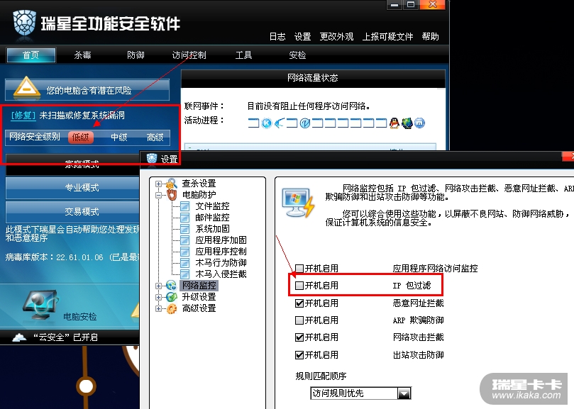 LZ使用的是瑞星全功能吗?尝试把网络安全级别调低,关闭IP包过滤查看是否正常。