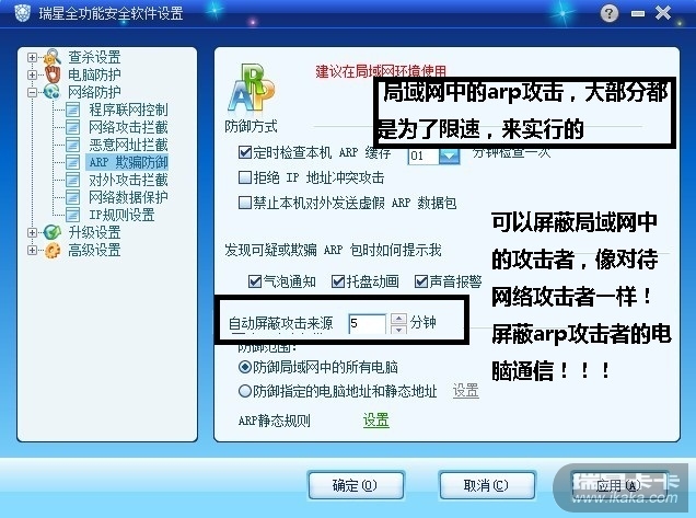 而目前的ARP防火墙也全是垃圾!什么360、瑞星、金山、彩影……没一个有用!想想吧,你的电脑把假的网关识别成了真网关,你再在那里不停地向网关发送你的正确IP和MAC有什么用?你根本就发错了地方耶,而这是由于系统目前的识别能力只有这么高,所以ARP限速根本无解