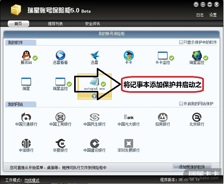 操作:将记事本程序加入 保险柜 保护,然后运行记事本,随之运行拦截软件