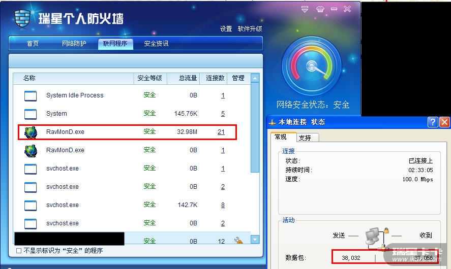 楼主,那个RavMonD.exe是瑞星个人防火墙的主进程。瑞星个人防火墙属于包过滤防火墙,你上网所有的网络数据包都流经瑞星个人防火墙,这样才能达到防护的目的。