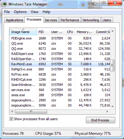昨晚上网时再次观察到RavMonD.exe占用大量CPU的情况,上一次出现此问题是在2月1日,尚未观察到任何规律。此现象一旦出现,RavMonD的CPU占用率就不会下降,禁用所有监控也没有变化,重启后才会恢复正常。
