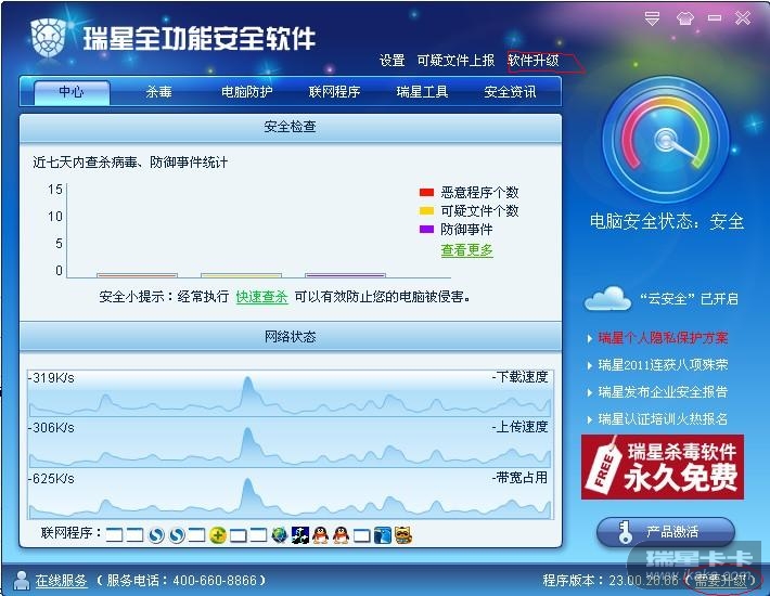 原先分开安装的瑞星杀毒和卡卡基本没出什么问题,自从免费后安装了全功能防护软件,就刚安装的时候可以更新,然后就再也无法更新,点更新按钮没有反应,而且老弹出激活界面,请问是为什么?谢谢。