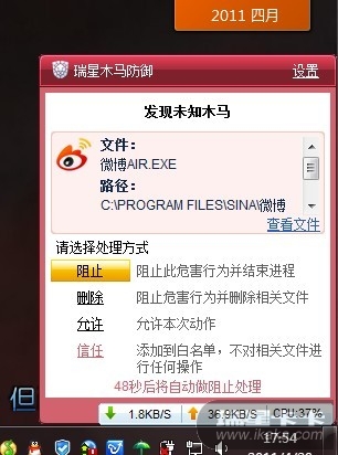 请右击托盘处的瑞星监控绿伞/查看日志/备份日志,将日志导出后上传,同时请上传日志中新浪微博的相关文件和瑞星软件版本号。