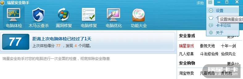 版主呀,这一看瑞星安全助手的界面咋这么像360安全卫士呀,而且功能也少很多,说实话,界面看起来没有安全卫士可靠呀