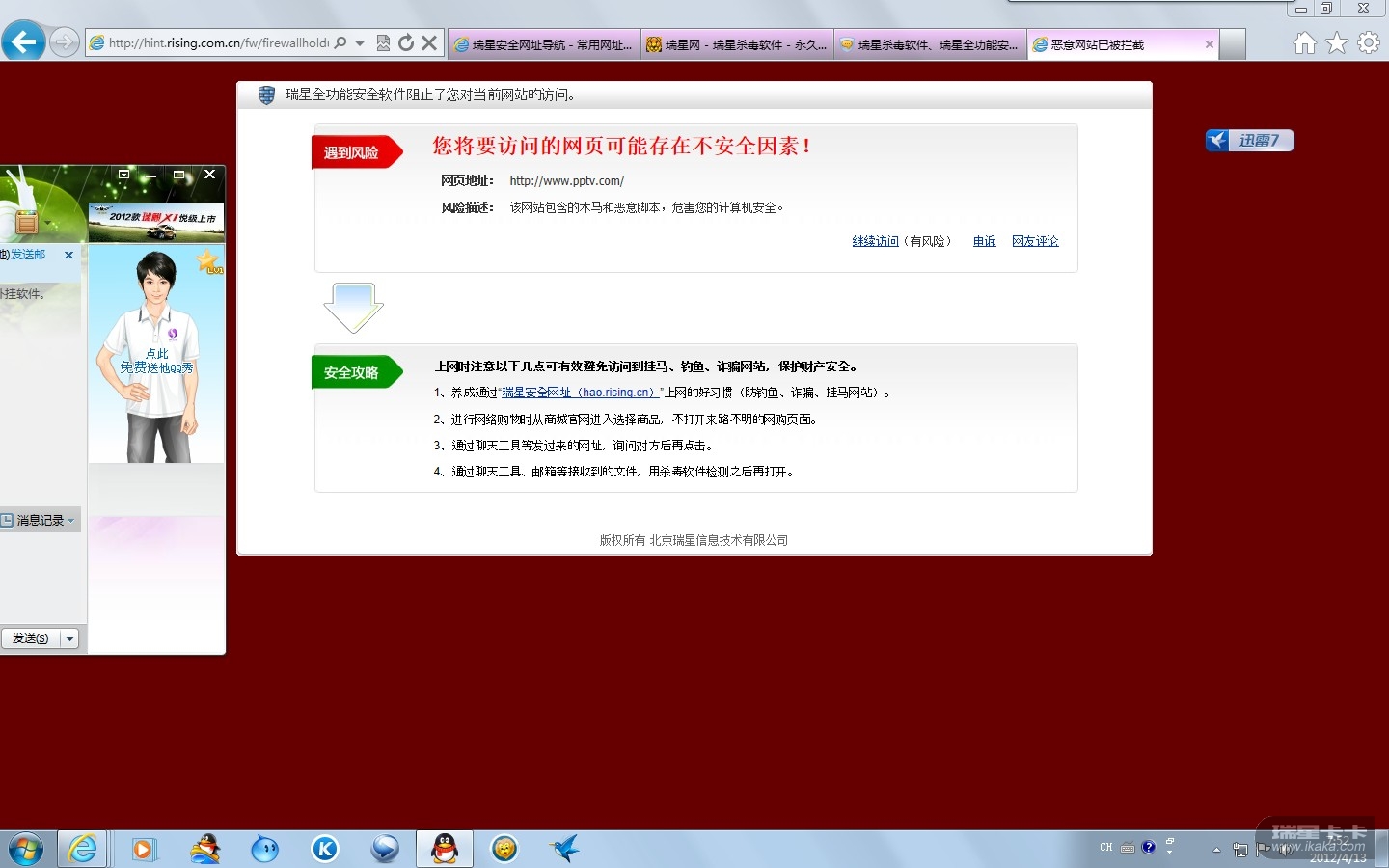在打开PPTV官方网站的时候,出现了瑞星防火墙拦截的信息。(如图所示)