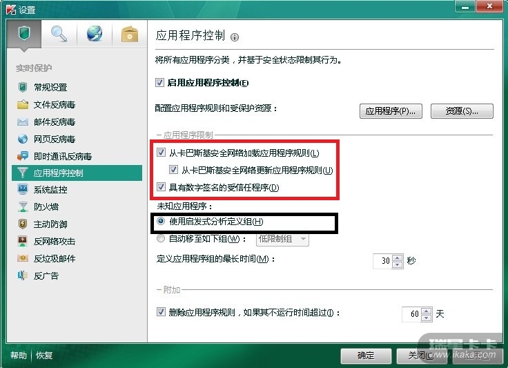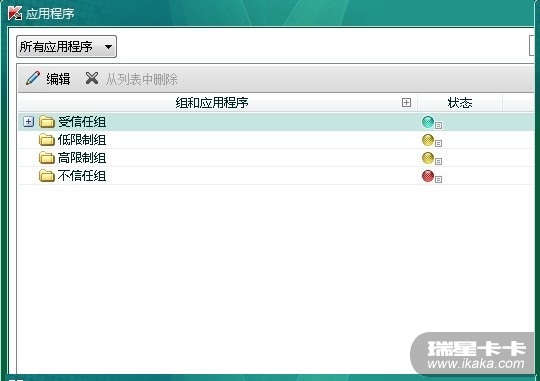 3、添加程序分组,按照安全级别分为白名单、低威胁、高威胁 黑名单(卡巴的分类为信任、低威胁、高威胁、不信任);并用动态启发引擎分组。