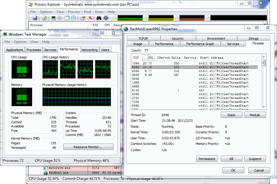 昨晚上网时再次观察到RavMonD.exe占用大量CPU的情况,上一次出现此问题是在2月1日,尚未观察到任何规律。此现象一旦出现,RavMonD的CPU占用率就不会下降,禁用所有监控也没有变化,重启后才会恢复正常。