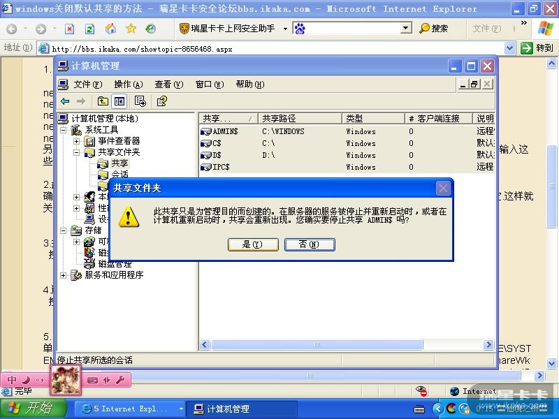 控制面板—管理工具—计算机管理—共享文件夹—共享,关闭里面的默认共享(包括admin$的删除)