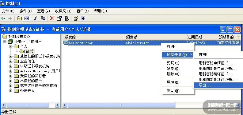 步骤六:单击“预期目的”栏中显示“加密文件系统”字样的证书。右键单击该证书,选择“所有任务”,然后单击“导出”。