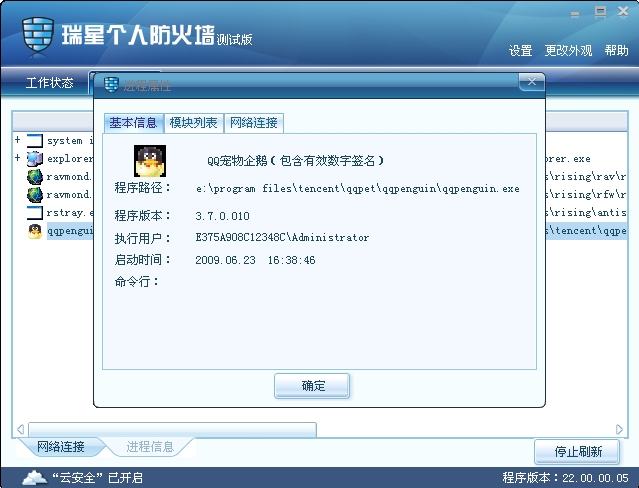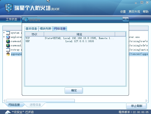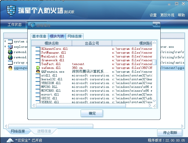 模块信息给了注入该进程的文件,如果是瑞星没有收录有的模块信息会用高亮的红色标出。