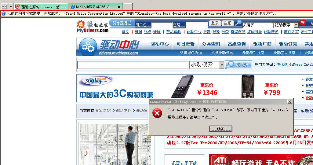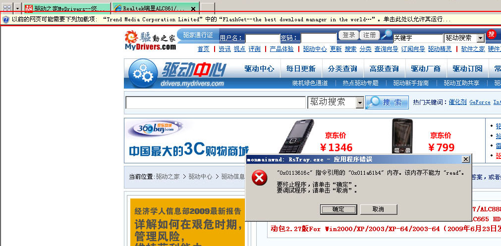 问题现象:在网页加载flashget下载时,瑞星报出2个错误,然后监控自动关闭。