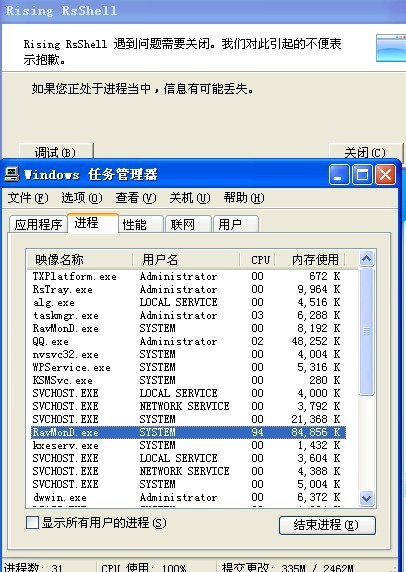 刚才我用了瑞星进行了杀毒。杀毒的时候只打开了瑞星的相关产品和QQ和影子系统软件,但是杀到后来就出现了问题,瑞星的界面变成黑色的了,因为当时很卡所以没有办法截图,后来我打开了任务管理器之后,发现瑞星杀毒的时候占内存特别的大