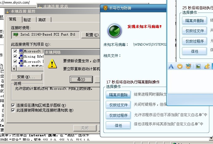 操作步骤是在本地连接里卸载一个协议,卸载提示失败,然后瑞星木马行为判断跳出来提示拦截