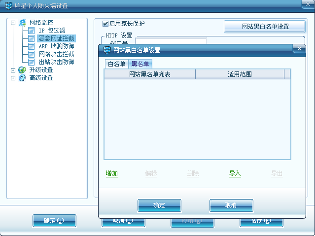 操作步骤:打开防火墙主界面→『设置』→『网络监控』→『恶意网址拦截』→『网站黑白名单设置』