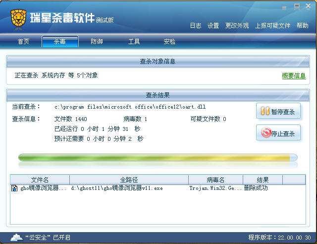 您好!我使用的是瑞星2010版杀毒软件(测试版)软件版本为:22.03.00.05 ,详情如下: