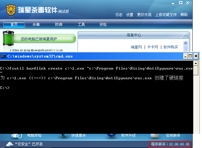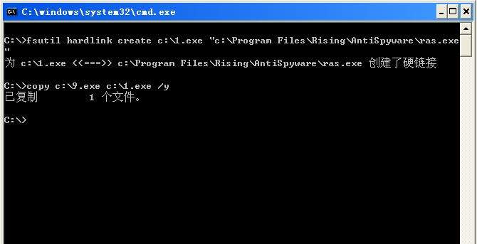 找一个瑞星22.03.05.21不认识的病毒9.exe,放到C盘根目录下,然后将其拷贝到刚建立的硬连接1.exe: