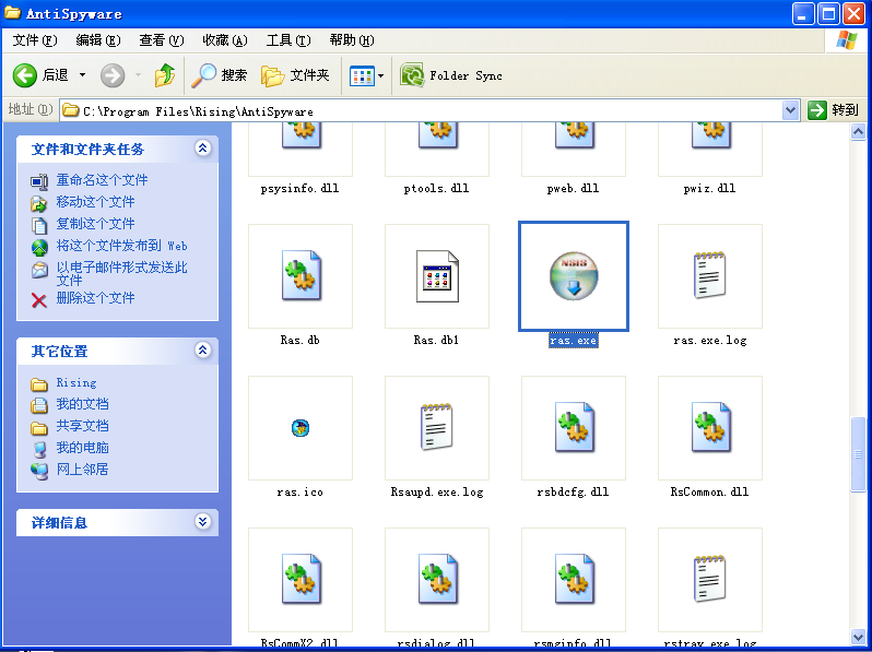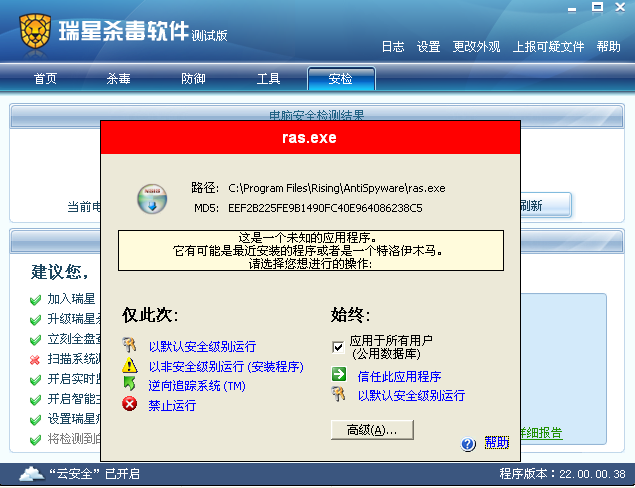 运行瑞星的“漏洞扫描,可见ras.exe已经被该病毒替换: