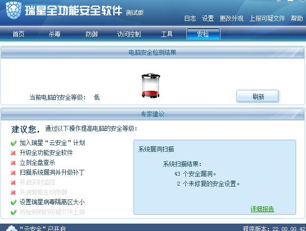 我的笔记本电脑是清华同方的 vita 商务版 , 安装瑞星测试版的时候出现了驱动安装许可提示,跳过后(估计是拒绝) , 蓝屏 ..死机 了,,,重新开机选择修复安装.,,但是修复多次 ,,重启多次,,,依然是不能打开监控(伞是红的),,打开所有监控和禁用所有监控都是灰色的.我怀疑在安装过程中和那个驱动程序冲突了,,如果管理员觉得这个有价值可以及时和我联系 13581602930,,我2小时后将重新卸载安装瑞星....