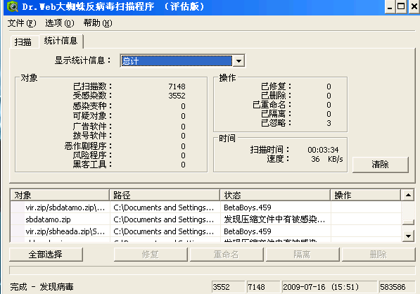 第二阶段来了,为此寻得了一个病毒包来测试瑞星,大概有3600个病毒吧。另外找了几个知名杀软来比较。(由于笔者第一阶段不曾参加,于是借了朋友的序列号用一下。)以下是截图: