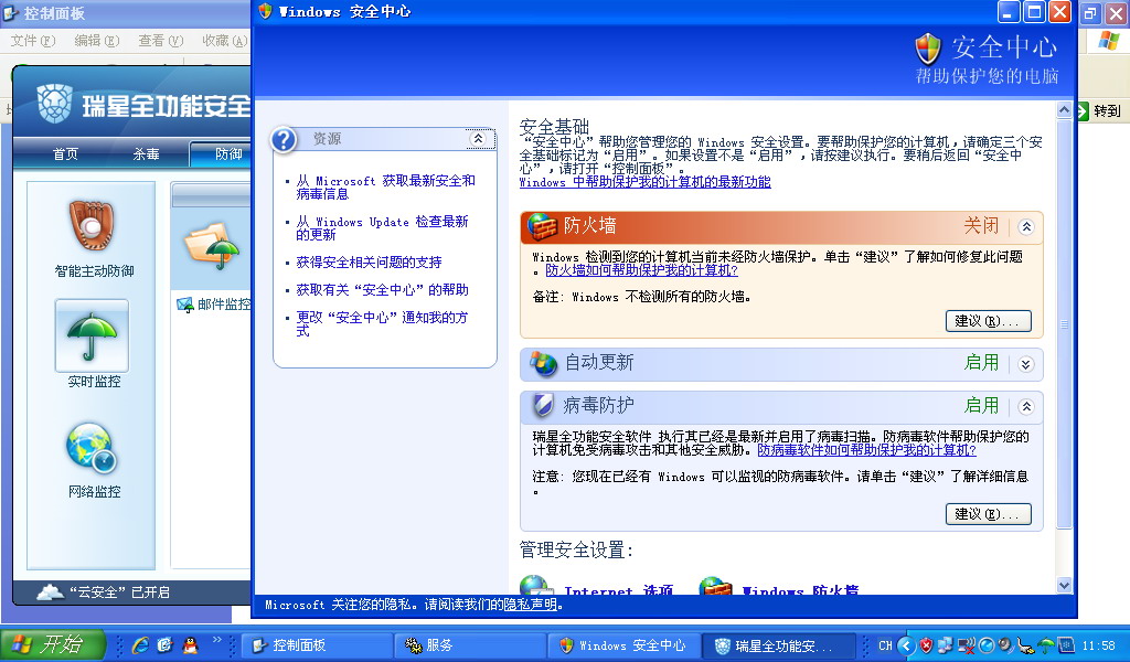 昨天把上网本的系统重新安装了一下,今天突然发现瑞星全功能安全软件不能被安全中心识别了!在安装完系统后首先安装的就是瑞星全功能2010版,今天想起瑞星2010全功能版不能自动关闭xp防火墙,所以我手动关闭,结果就发现了这个!