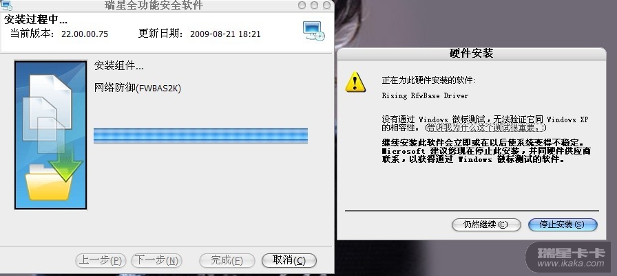 我刚刚安装了瑞星2010,可是在安装软件时出现了一个问题,在安装FWBAS2K(网络防御)时,系统弹出对话框(继续安装软件会使WINDOWS系统变的不稳定)。我点击了“仍然继续”可是还是不行,最后我想可能是我宽带的原因,所以,我禁用了本地连接,费了一番周折,我终于安装好了瑞星2010。