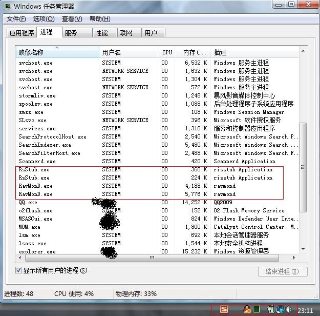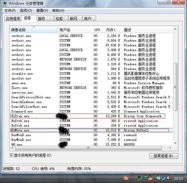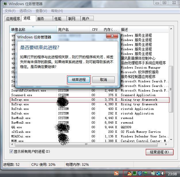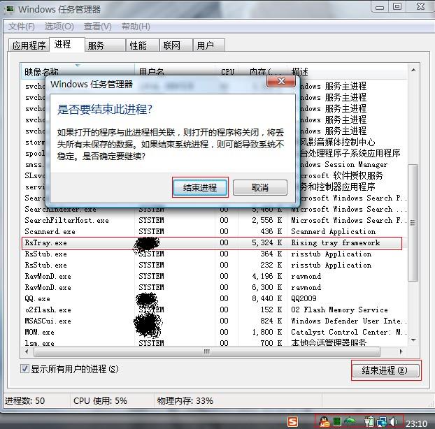 现在只有一个RsTay.exe进程了,这个进程是瑞星杀毒软件的进程,也点击结束进程(如图4);