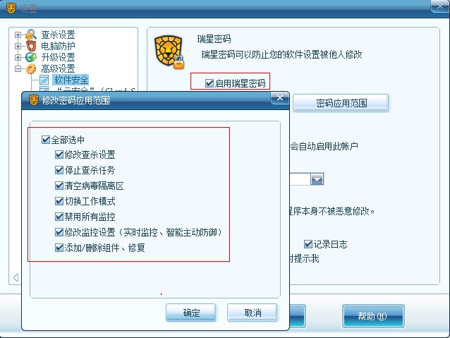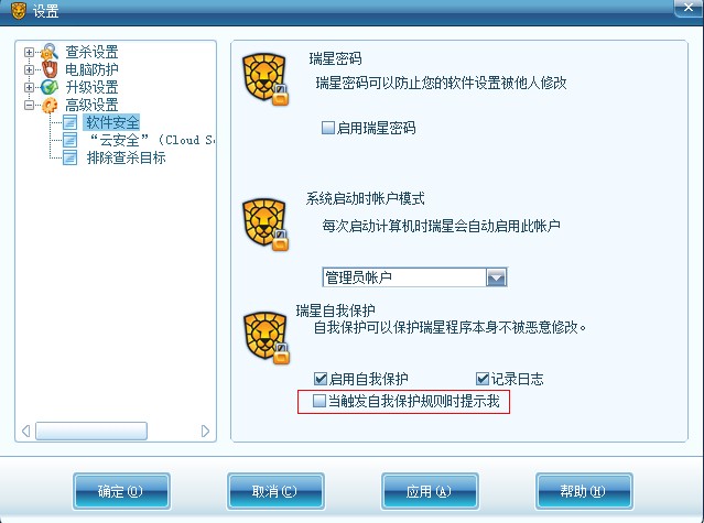 我在瑞星杀毒软件里设置“当触发自我保护规则时提醒我”(如图7)和启动瑞星密码(如图8)后结果还是那样,可以直接在任务管理器中结束瑞星杀毒软件和防火墙。