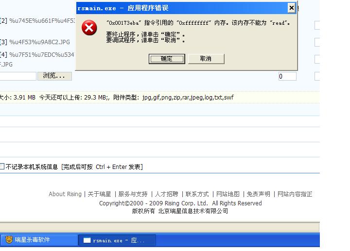 工具栏下面的瑞星还在工作,帖子也正在编辑,突然眼前一亮,瑞星报错,点击无数终于消失,狮子也就没了,汗死。昨天本本测试也出现类似情况,但瑞星当时并没崩溃
