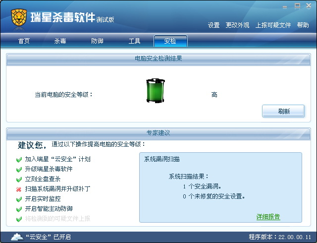 为什么瑞星扫描有一个漏洞,通过点击详细报告进入卡卡却显示没有?再通过瑞星扫描漏洞还在啊?