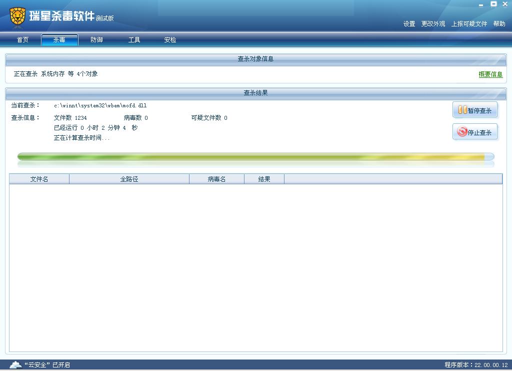 由图可以看到,WIN2000系统下,本人选择查杀关键区域,杀毒进度条都基本到头了,但是查杀时间却还在计算中,前期杀毒进度条走得太快了,希望修改下。