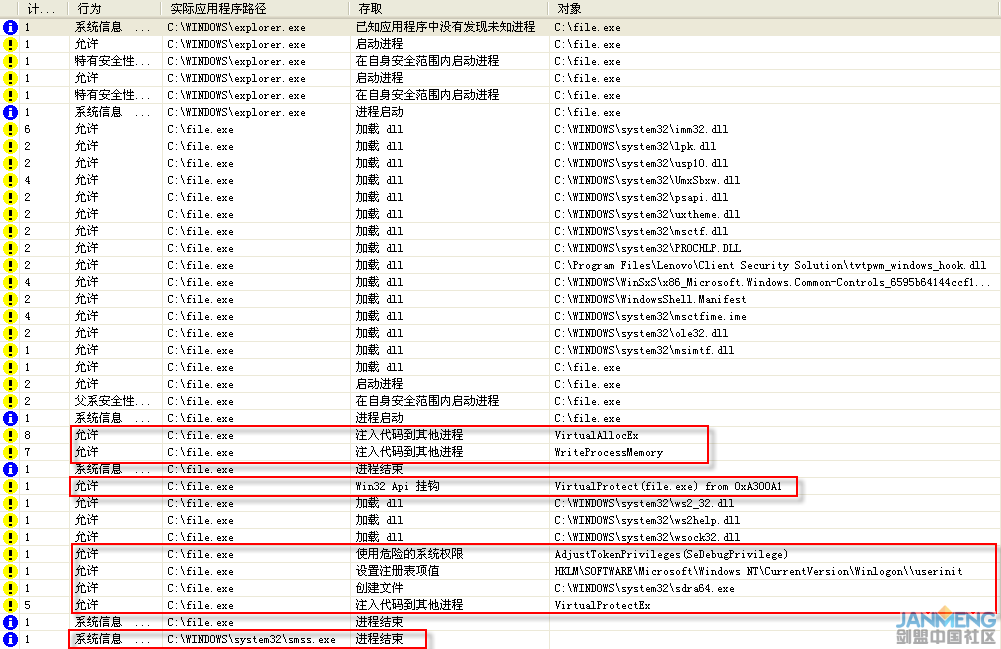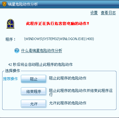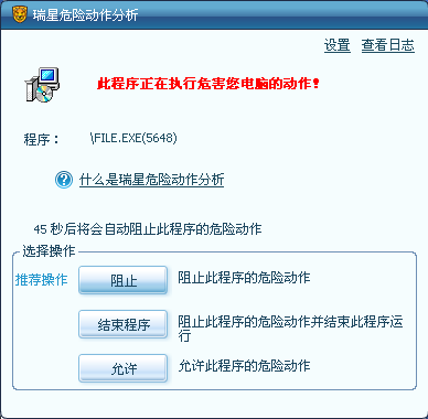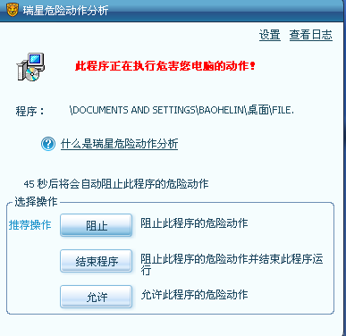 瑞星2010“危险动作分析”发现它后,用户反复点击“阻止”,拦截界面反复出现。直到我用IceSword结束病毒进程File.exe。