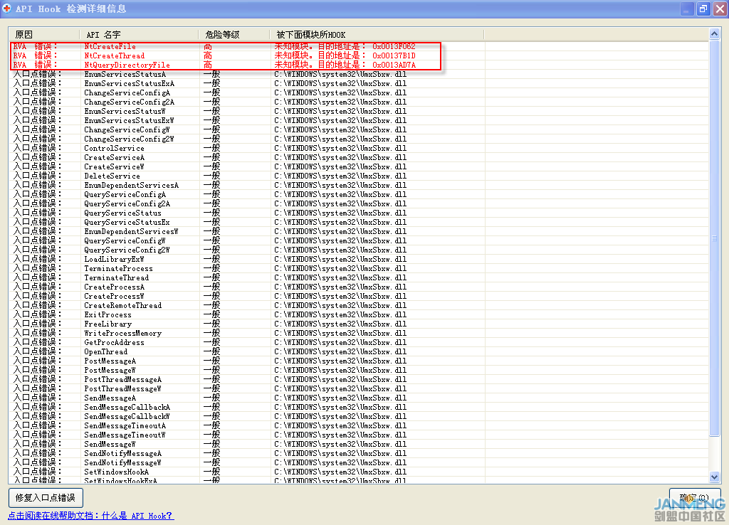 2、瑞星2010的“危险动作分析”可以发现它,但处理它时有缺陷。