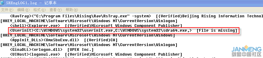 仅看SRENG日志,用户会上当。SRENG日志的加载项部分报病毒文件sdra64.exe丢失(其实并未丢失)。