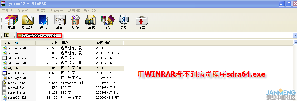 常用WINRAR查看病毒文件者也容易上当————WINRAR根本看不到病毒文件sdra64.exe(其实这是一种假象)。