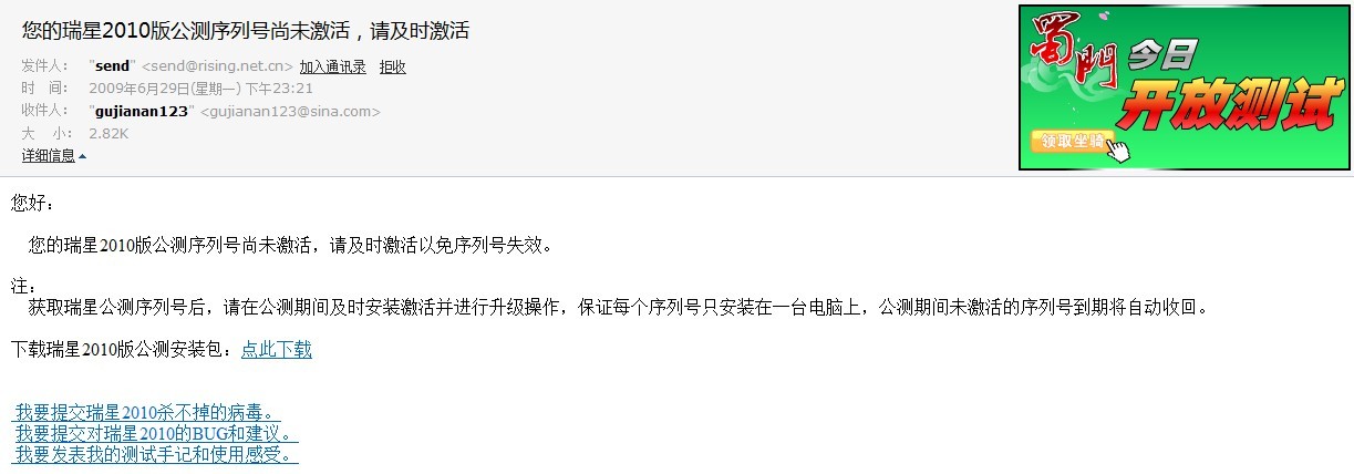 测试经过:使用2010版瑞星杀毒软件(测试)的时候说当前激活成功了。