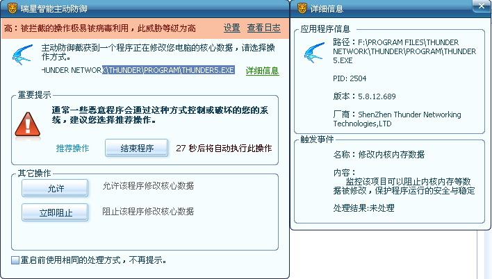 瑞星报迅雷修改核心数据,并认定威胁为:高