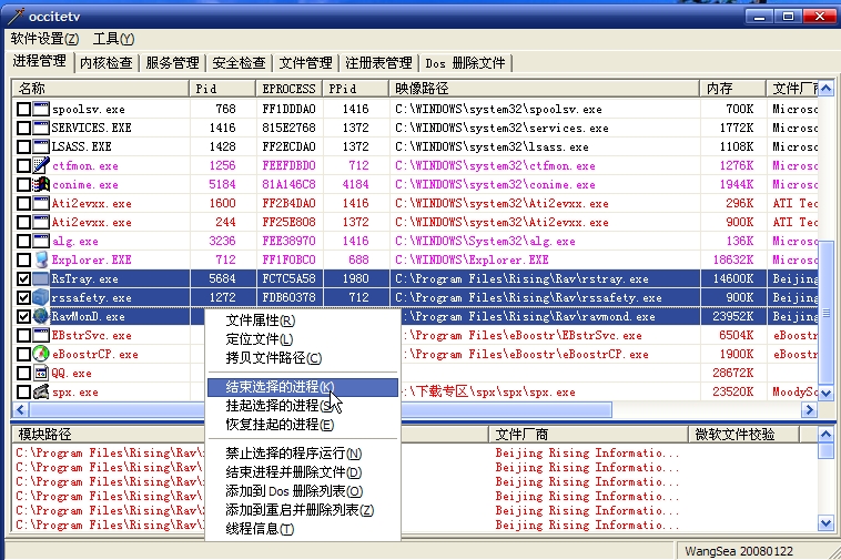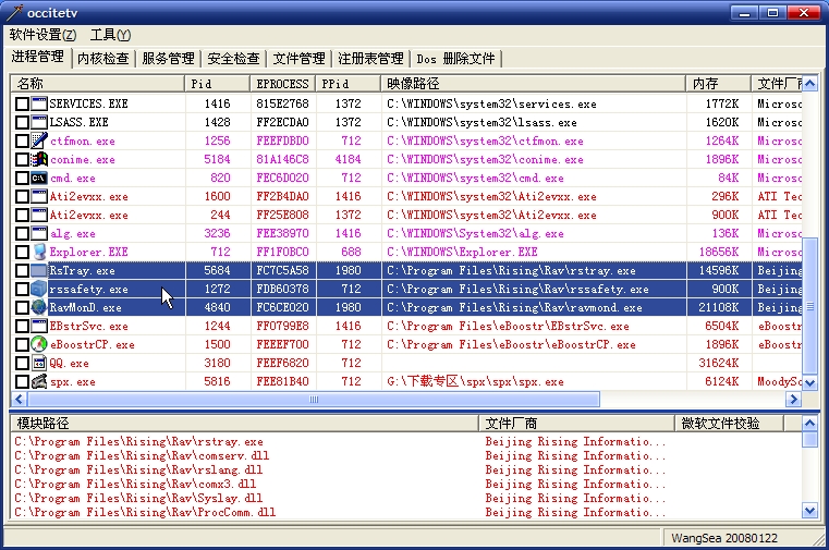 打开wsyscheck,找到瑞星杀毒软件2010测试版的进程,选中: