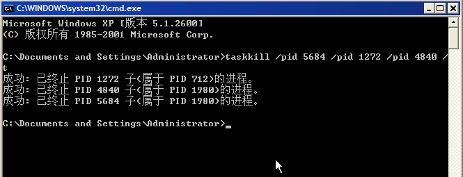 首先点击开始——运行,输入cmd,弹出命令提示符框,接下来使用taskkill命令来尝试杀死瑞星杀毒软件进程。输入taskkill /pid 5684 /pid 1272 /pid 4840 /t然后回车,命令结果显示成功!