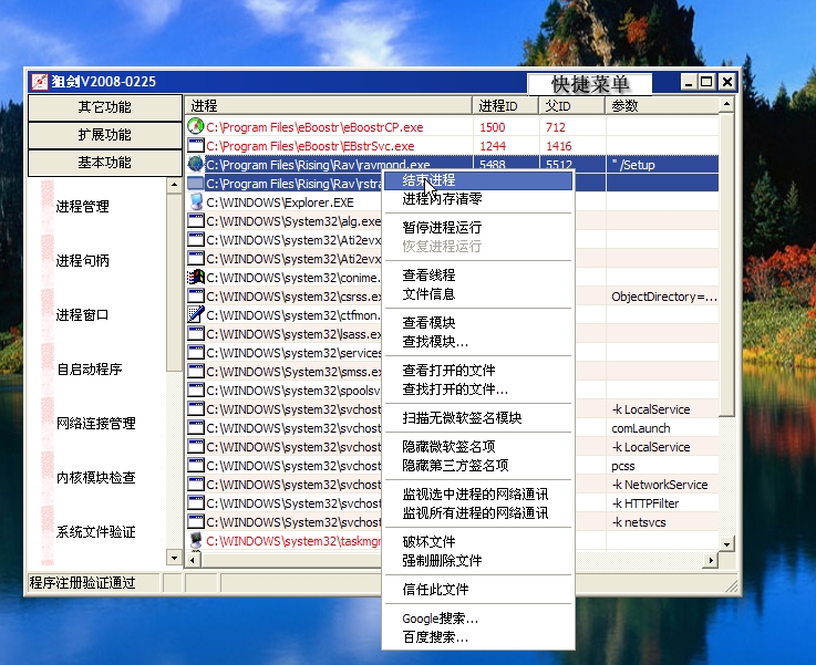 总结:对于非驱动级对抗,瑞星的表现还是不错的!当然,Beby小孩测瑞星做了一个程序,并没有加载驱动,但是瑞星被kill了,样本我想瑞工应该有了的,没有去群里要!至于驱动级对抗,瑞星显得明显过弱,瑞工的手记我看过,对安全软件不设防,但是我认为还是有必要的加强一下!