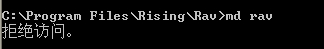 打开cmd命令提示符,然后进入的瑞星的Rav目录,输入md Rav,即在Rav文件夹下建立一个名为Rav的目录,结果显示拒绝访问!瑞星报警!