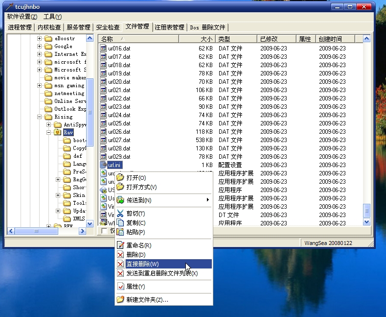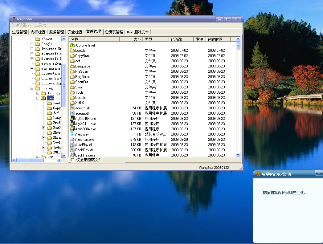 wsyscheck对于硬盘文件管理还是蛮多好的!同样,进入到瑞星Rav目录,随便找一个文件,右键——直接删除。结果:失败,瑞星报警!