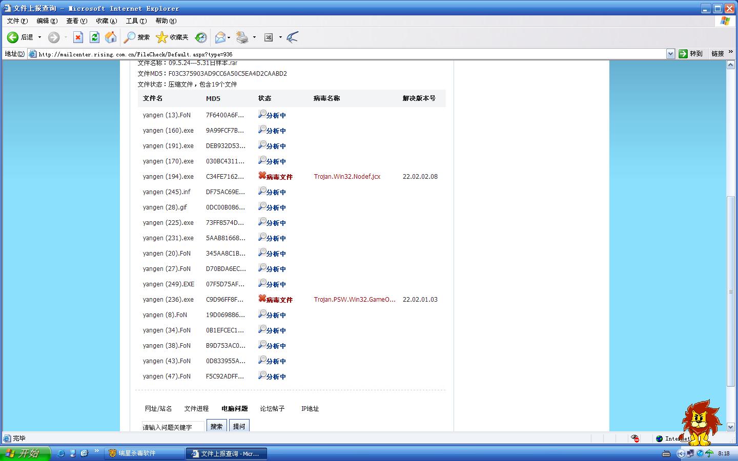 然后,我按照瑞星的分析结论中所说的把杀软病毒库版本升级到22.03.00.10(软件版本22.00.00.30)后,再来查杀瑞星分析诊断到的病毒,结果,不知为什么还是查杀不到。今天的两次查杀结果见下面图八的截屏: