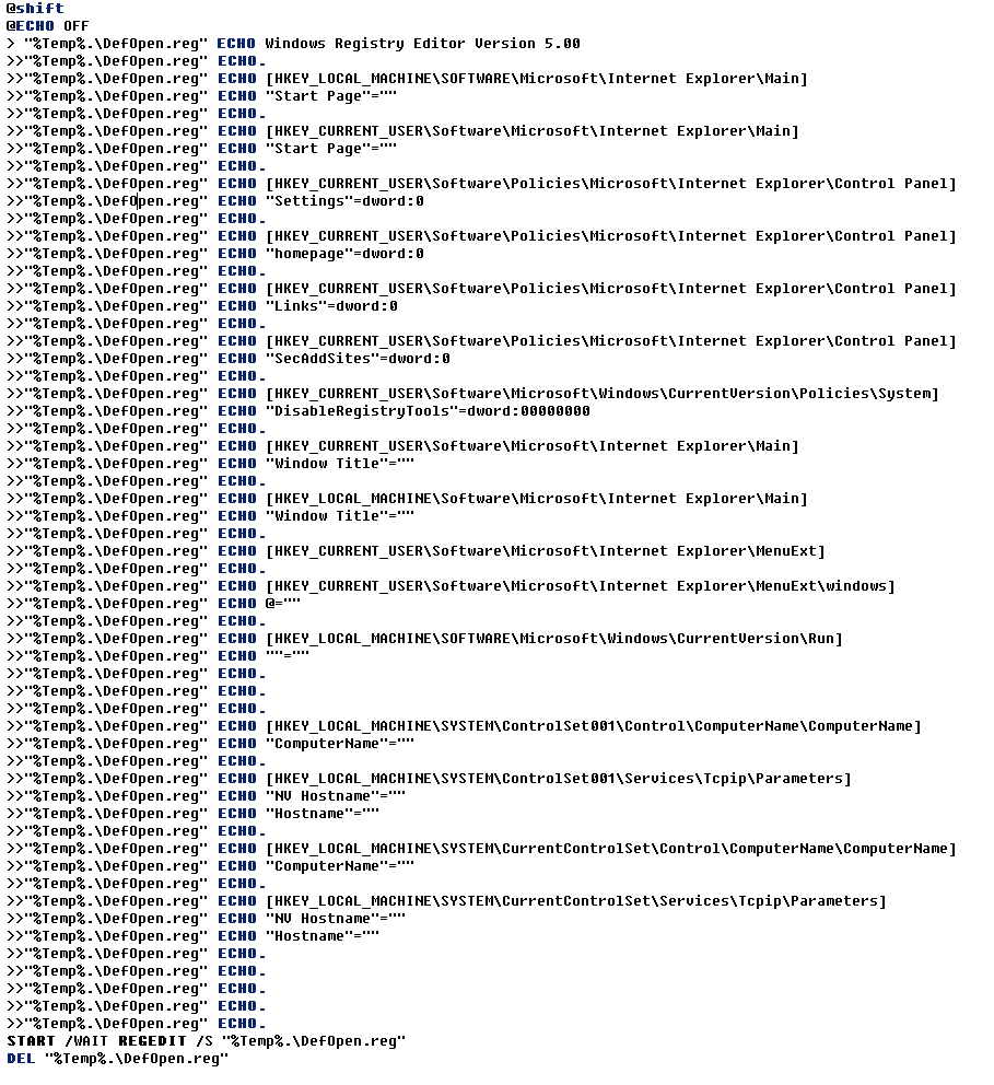 >>"%Temp%.\DefOpen.reg" ECHO [HKEY_CURRENT_USER\Software\Microsoft\Internet Explorer\MenuExt]