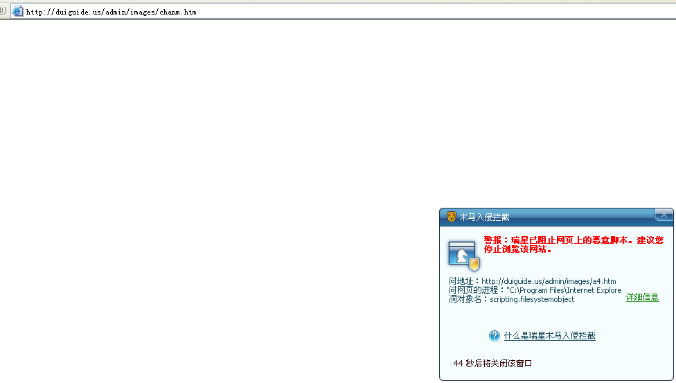由于瑞星的云安全对于挂马网页能够及时地做出反应,进行查杀。下面打开一个挂马网页来检验