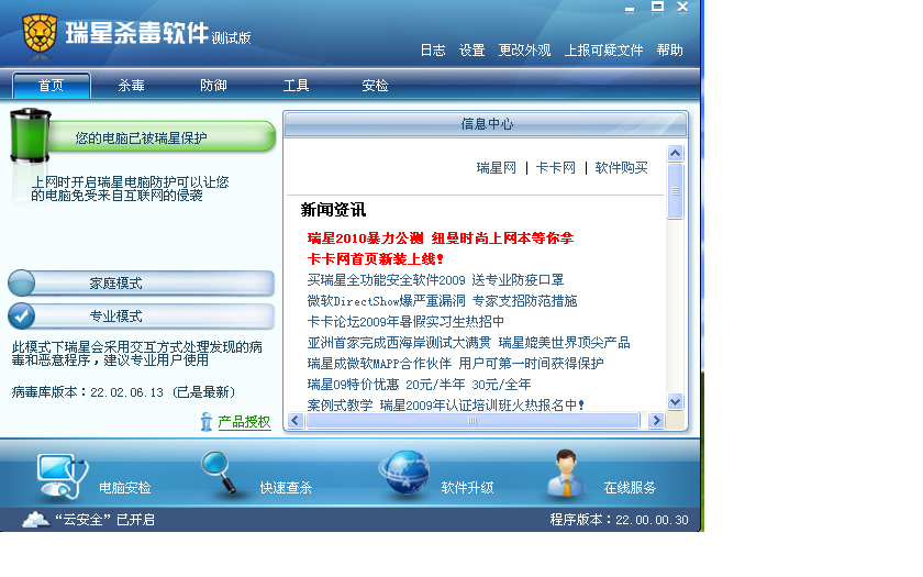 瑞星2010测试火爆进行中,各路豪杰云聚于此,大有暴力之势,不把瑞星2010之漏洞揭开完,没有散场之势。漏洞,缺点不当之处也让大家提得差不多了。作为瑞星的测试,浅浅的展示瑞星的防毒功能。