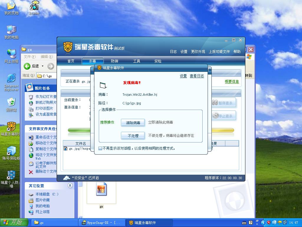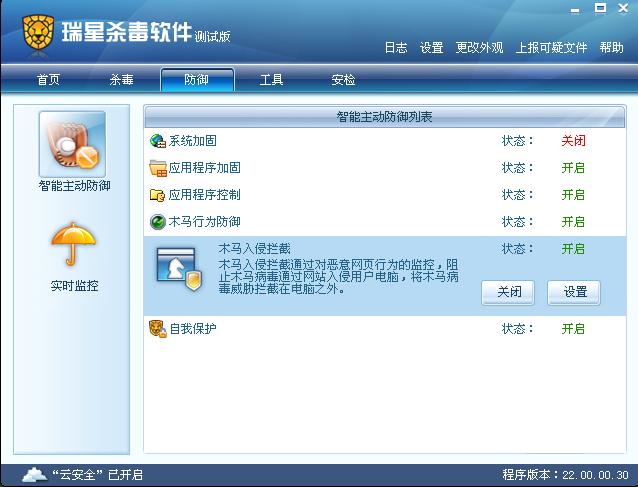 我们先看一下瑞星的木马行为防御对已知病毒的处理!关闭掉文件监控和系统加固监控!