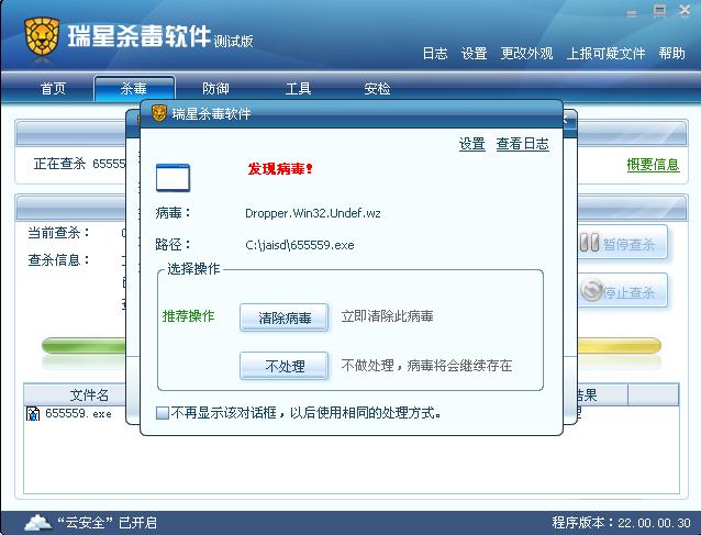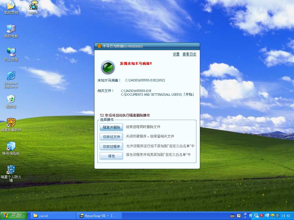 新版本中的技术亮点,它能分析未知和已知病毒的行为,当运行带有恶意行为的程序时,瑞星能及时的阻止和隔离这个程序!