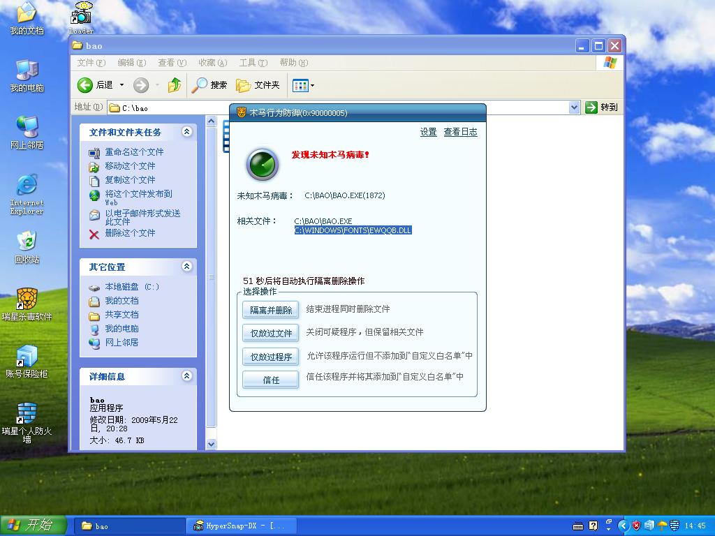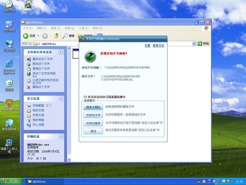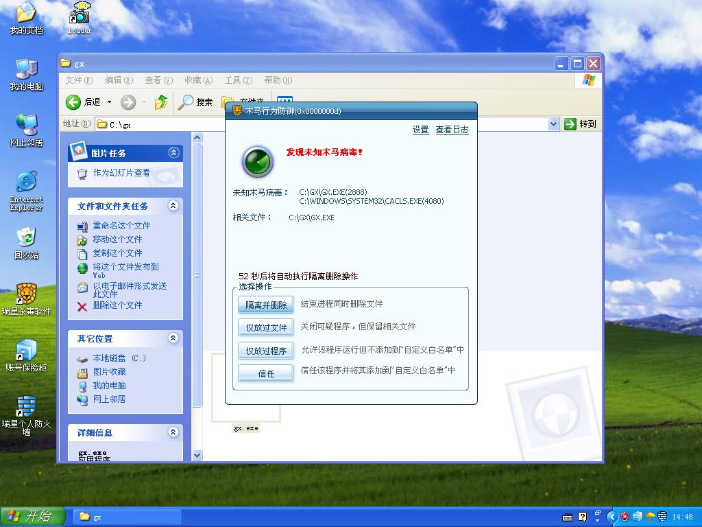 可以看到瑞星的这个报告中提供给用户的有相应的未知木马病毒的路径,对应相关文件的程序的路径,用户能进行的操作包括了隔离并删除,仅放过文件,仅放过程序,信任,这些选项!我们选择隔离并删除后病毒和相关的文件程序都将被放置到病毒隔离区