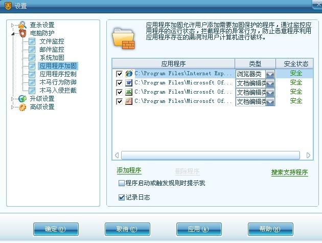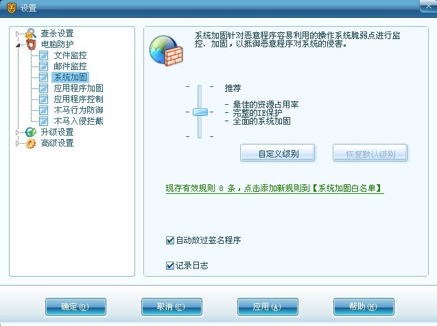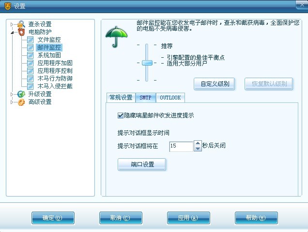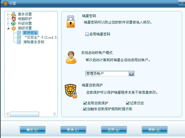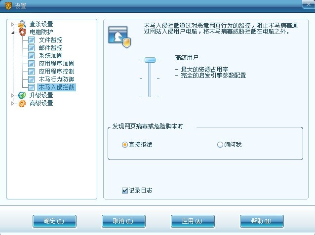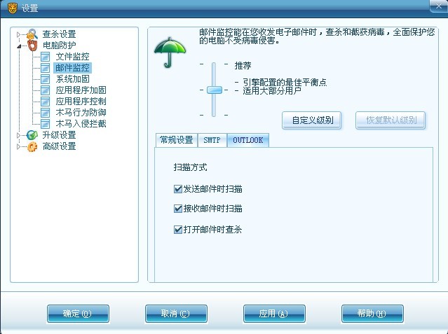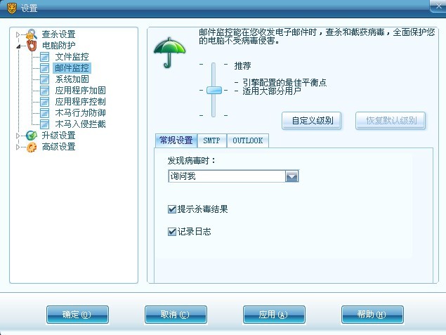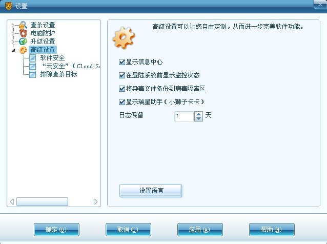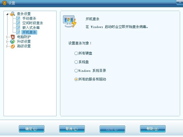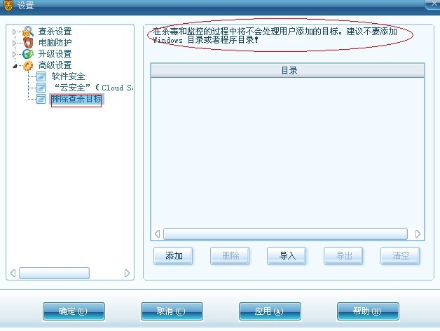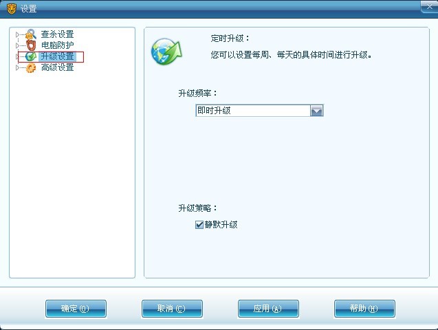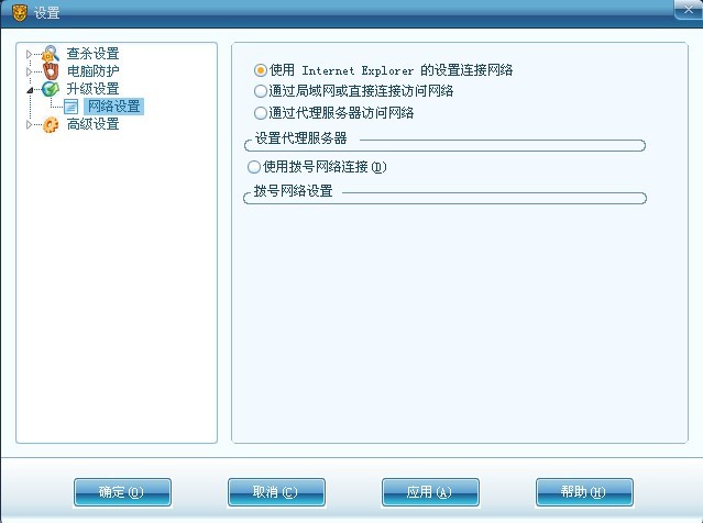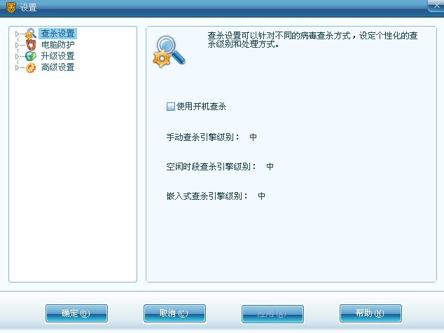 左侧框架中 只有 【查杀设置】【电脑防护】【升级设置】【高级设置】 四个 大的设置方向
